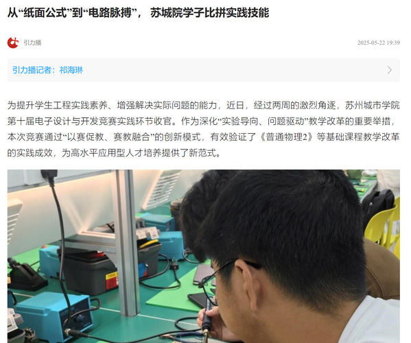 作为本次竞赛的主要理论支撑,该校《普通物理2》课程团队近年来着力构建“三段三层”混合式教学体系,即通过线上导学、线下讲授与实验探究递进融合,基础层、融合层与创新层协同展开,聚焦学生“从物理原理到工程应用”的能力提升。课程负责人丁云表示,本次竞赛不仅是一次专业技能的集中演练,更是基础课程教学改革成果的重要检验平台,参赛队伍将课程中的电子设计方法与实验原理灵活运用至竞赛方案中,体现了课程内容的实践拓展价值。