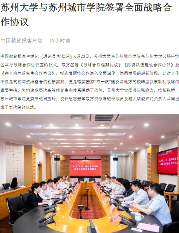 此次战略合作的达成,是驻苏高校优势互补、协同服务地方经济社会发展的生动实践,构建了“战略引领-资源整合-机制创新-效能转化”的深度合作范式,为全国地方高校与研究型大学协同发展提供了“苏州方案”,也为长三角教育一体化发展注入了新的动能,将为苏州加快建设展现“强富美高”新图景的社会主义现代化强市提供更为坚实的高等教育支撑。