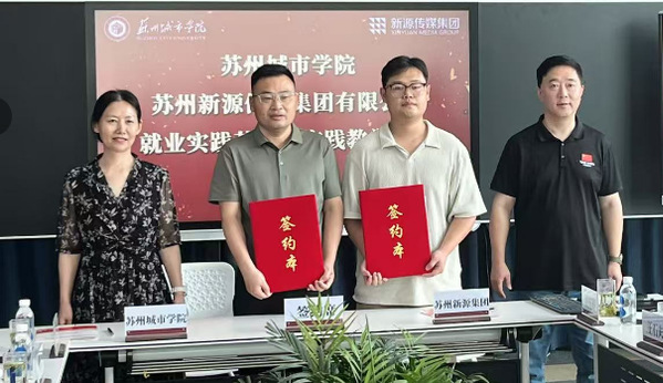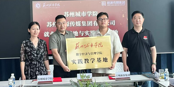 为深入贯彻产教融合发展理念,构建教育与企业协同育人新生态,6月24日,苏州城市学院数字经济与管理学院与苏州新源传媒集团有限公司举行实践教学基地签约仪式。此次仪式在新源传媒集团3楼会议室成功举办,标志着双方在数字经济领域正式开启深度合作,共同探索“教学+实践”融合新模式,为培养高素质应用型人才奠定坚实基础。