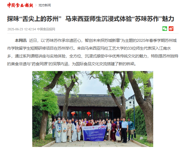 近日,以“苏味苏作承非遗匠心,智创未来探苏城新章”为主题的2025年春季学期苏州城市学院留学生短期研修项目在苏州举行。来自马来西亚玛拉工艺大学的33位师生代表深入江南水乡,通过系列课程讲座与实地体验,全方位、沉浸式感受中华优秀传统文化的魅力,特别是苏州独特的美食非遗与“药食同源”的深厚内涵,为国际食品文化交流搭建了新的桥梁。