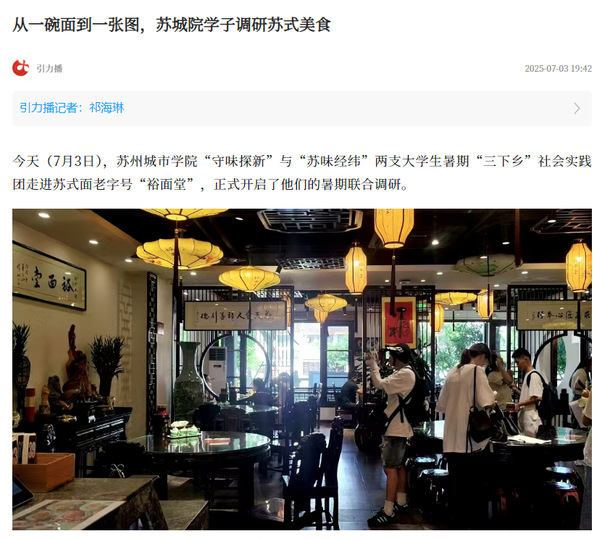 实践团指导老师、苏州城市学院康养产业学院负责人、副教授张宇表示:“这两支团队的研究,一个聚焦微观的‘守味’与‘创新’,一个着眼宏观的‘经纬’与‘振兴’。从一碗面到一张图,完美诠释了我们《江南苏味美食营养与非遗技艺》这门校级重点课程‘文化+科学+实践’的教学理念,旨在培养学生用‘人文经济’的眼光,洞察传统文化的现代价值。”