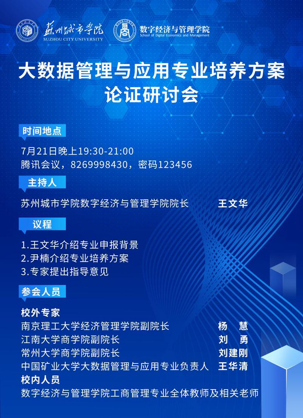 7月21日晚,数字经济与管理学院依托腾讯会议平台,顺利召开大数据管理与应用专业培养方案论证研讨会。此次会议由学院院长王文华主持,特邀南京理工大学、江南大学、常州大学、中国矿业大学4位校外专家,协同学院相关教师,共同为专业人才培养方案精准“把脉”、献智赋能。