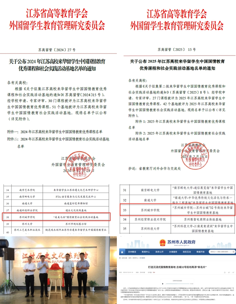 与姑苏区沧浪街道合作共建“苏州城市学院—苏州古城32号街坊来华留学生中国国情教育基地”,获批江苏省高等教育学会外国留学生教育管理研究委员会“2025年江苏高校来华留学生中国国情教育社会实践活动基地”。活动取得良好的社会反响,获得《苏州日报》头版、苏州市人民政府网站等主流媒体报道。