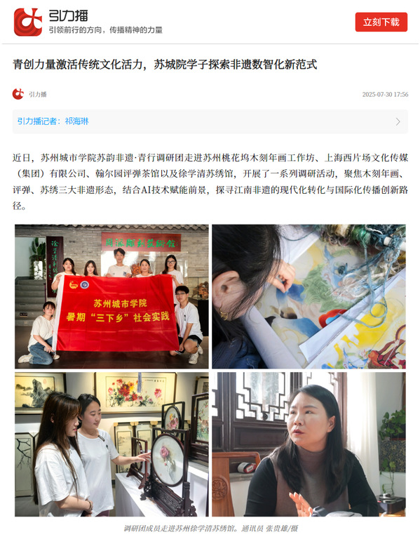 近日,苏州城市学院苏韵非遗·青行调研团走进苏州桃花坞木刻年画工作坊、上海西片场文化传媒(集团)有限公司、翰尔园评弹茶馆以及徐学清苏绣馆,开展了一系列调研活动,聚焦木刻年画、评弹、苏绣三大非遗形态,结合AI技术赋能前景,探寻江南非遗的现代化转化与国际化传播创新路径。