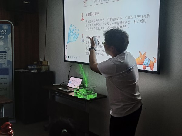 实验现象极易引起孩子们的好奇。借助激光笔、装满水的透明水槽还,吴振兴演示光的折射小实验:激光笔在空气中射出笔直的光束,却倾斜射入水中。“这,就是光的折射。”主讲人解释道,“光在水和空气交界处,传播方向会发生偏折。”
