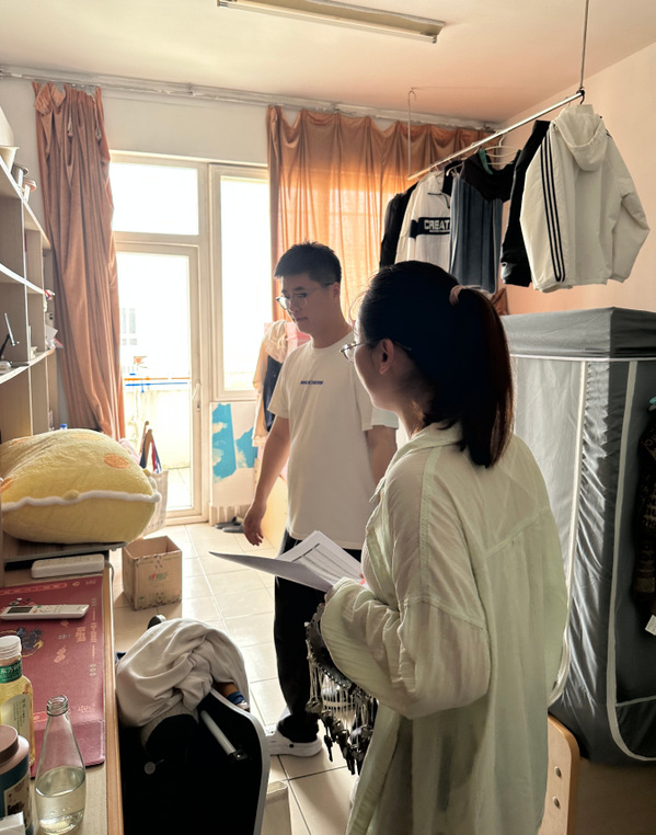 走访过程中,辅导员面对面了解学生的留校安排,并就宿舍卫生安全、留校纪律等事项重点提醒,嘱咐在校学生充分利用好暑期时间,认真备考及提升实践能力,注意做好防火防诈等工作,以饱满的精神状态迎接新学期。