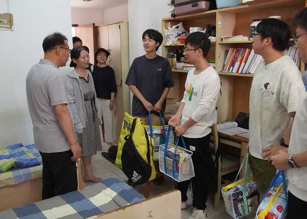 8月18日上午,校党委常委、副校长吴昌政、孙德芬带领相关职能部门负责人及我院辅导员老师,深入学生宿舍进行实地走访慰问。在宿舍区,校领导与留宿学生亲切交谈,亲手送上“降温防暑包”,叮嘱大家注意防暑降温,劳逸结合。同时,校领导仔细查看宿舍环境,了解空调、水电等设施运行情况,提醒同学们注意用电安全、消防安全和个人财物安全,强调遵守宿舍管理规定,共同维护良好的生活环境。
