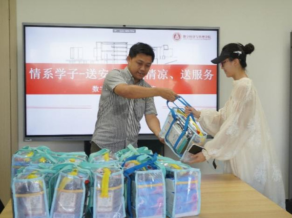 座谈会结束后,邵杰老师为与会学生代表及在考研自习室复习的同学发放了“降温防暑包”。邵老师表示,“学院始终关心每一位学子的成长发展,希望大家要注意劳逸结合,做好防暑降温,以饱满的精神状态迎接挑战。”
