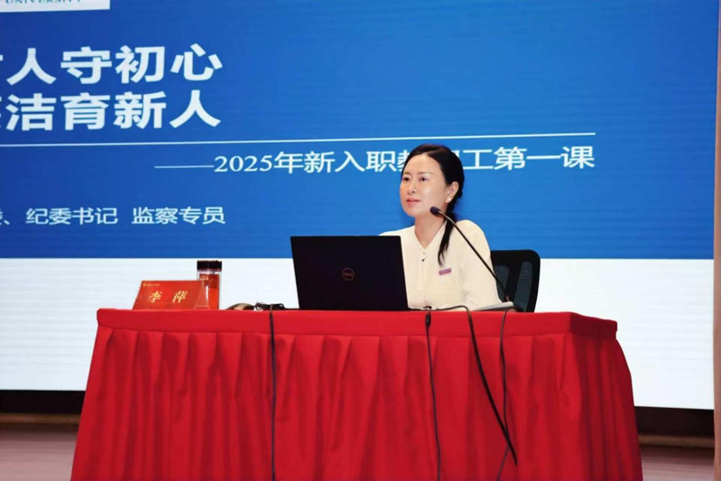 开班仪式结束后,李萍以《立德树人守初心 清正廉洁育新人》为题,为新教工讲授“入职第一课”。她重点介绍学校的发展历史、办学特色和发展愿景,结合典型案例,详细解读师德师风建设内涵、树立意识形态安全责任观的路径及廉洁从业要求。她强调,作为新入职教职工,应视岗位为“考场”、责任为“考题”、工作为“答卷”,常怀“赶考”之心,筑牢思想防线、恪守职业底线、严守纪律红线,努力成为政治坚定的“明白人”、清正廉洁的“规矩人”、务实进取的“示范人”,为学校高质量发展贡献应有之力。
