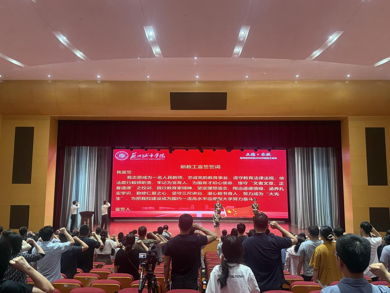 随后,“苏超”苏州队队长、我校基础教学部教师陈伟带领全体新教工面向国旗庄严宣誓,以铿锵有力的誓言表达坚守立德树人初心、担当教书育人使命,践行教育家精神、努力成为“大先生”的决心与信心。