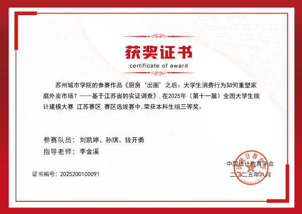 在第十一届全国大学生统计建模大赛中,由苏州城市学院数字经济与管理学院学子完成的作品《厨房“出圈”之后:大学生消费行为如何重塑家庭外卖市场?——基于江苏省的实证调查》,从全省众多参赛作品中突围,荣获江苏省三等奖,书写学科竞赛崭新篇章。
