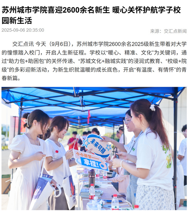 交汇点讯 今天(9月6日),苏州城市学院2600余名2025级新生带着对大学的憧憬踏入校门,开启人生新征程。学校以“暖心、精准、文化”为关键词,通过“助力包+助困包”的关怀传递、“苏城文化+融城实践”的浸润式教育、“校级+院级”的多彩迎新活动,为新生织就温暖的成长底色,开启“有温度、有情怀”的青春新篇。