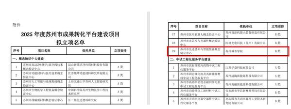 近日,苏州市科学技术局公布了2025年度苏州市成果转化平台建设项目拟立项名单,我校申报的“苏州市先进感知与智能装备概念验证中心”成功获批,这是我校获批的首个概念验证中心。
