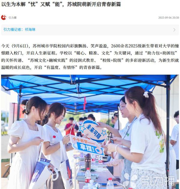 今天(9月6日),苏州城市学院校园内彩旗飘扬、笑声盈盈,2600余名2025级新生带着对大学的憧憬踏入校门,开启人生新征程。学校以“暖心、精准、文化”为关键词,通过“助力包+助困包”的关怀传递、“苏城文化+融城实践”的浸润式教育、“校级+院级”的多彩迎新活动,为新生织就温暖的成长底色,开启“有温度、有情怀”的青春新篇。