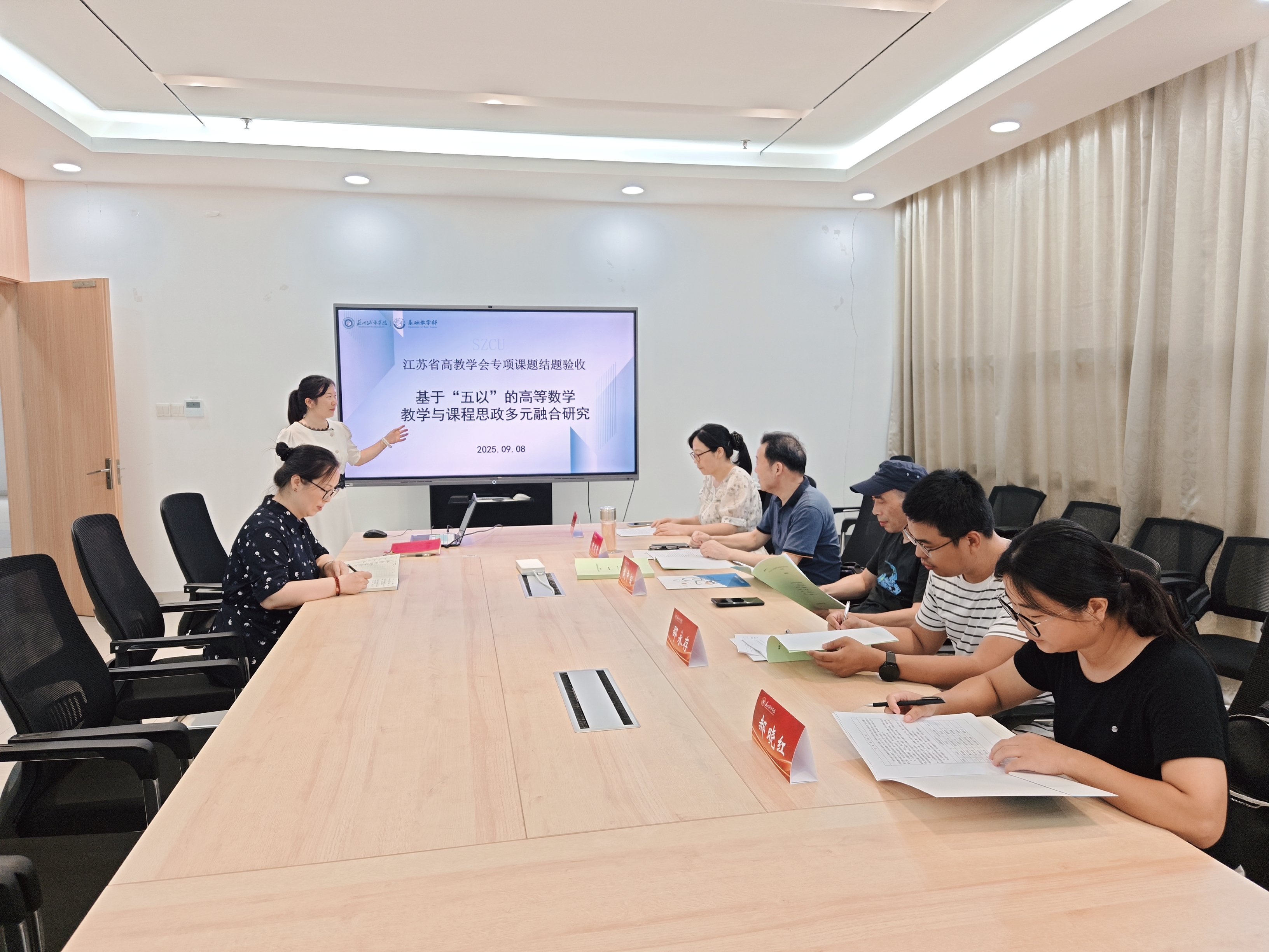 根据江苏省高教学会“高质量公共课教学改革研究”专项课题项目建设要求,9月8日,我部在师生服务大楼209会议室对《基于“五以”的高等数学教学与课程思政多元融合研究》(项目编号:2024GZJX099)专项课题进行了结项验收。 验收会邀请到了苏州科技大学教授朱建青、苏州大学副教授戴中寅以及我校副教授郝晓红、李益清和邵永存5人组成验收专家组。