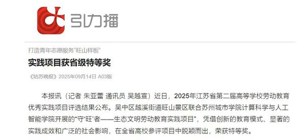 近日,2025年江苏省第二届高等学校劳动教育优秀实践项目评选结果公布。吴中区越溪街道旺山景区联合苏州城市学院计算科学与人工智能学院开展的“守‘旺’者——生态文明劳动教育实践项目”,凭借创新的教育模式、显著的实践成效和广泛的社会影响,在全省高校参评项目中脱颖而出,荣获特等奖。
