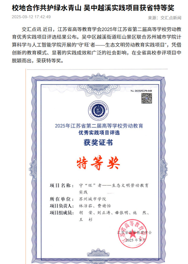 近日,江苏省高等教育学会2025年江苏省第二届高等学校劳动教育优秀实践项目评选结果公布。吴中区越溪街道旺山景区联合苏州城市学院计算科学与人工智能学院开展的“守‘旺’者——生态文明劳动教育实践项目”,凭借创新的教育模式、显著的实践成效和广泛的社会影响,在全省高校参评项目中脱颖而出,荣获特等奖。