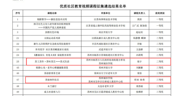近日,2025年江苏省优质社区教育视频课程征集遴选结果正式揭晓,我校两门课程喜获佳绩。张宇副教授负责的《苏工苏作·苏味苏艺-苏式生活》课程荣获二等奖,程承副教授负责的《苏扇制作技艺》课程荣获三等奖。此次获奖充分彰显了我校在社区教育领域的卓越实力,也是我校积极践行融城战略、服务地方发展的生动体现。