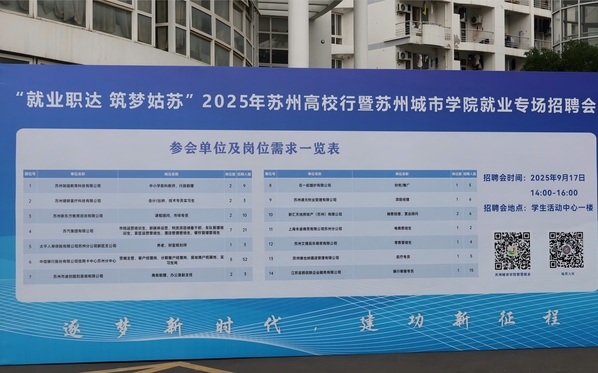 为切实搭建校企精准对接平台、助力2026届毕业生高效求职与顺利就业,强化校地就业区域协同联动,我校于9月17日下午在学生活动中心一楼举办“就业职达,筑梦姑苏”2025年苏州高校行暨苏州城市学院就业专场招聘会,此次活动也标志着我校2026届毕业生就业指导工作正式启动。