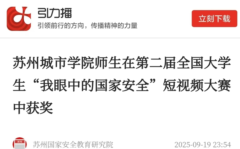 近期,由国家有关主管部门、教育部思想政治工作司、全国学校国家安全教育指导委员会指导,北京师范大学、广东省国家安全人民防线建设工作小组办公室主办的第二届全国大学生“我眼中的国家安全”短视频大赛获奖名单公布,苏州城市学院师生作品《国家安全,你我皆是守护人》荣获优秀奖。