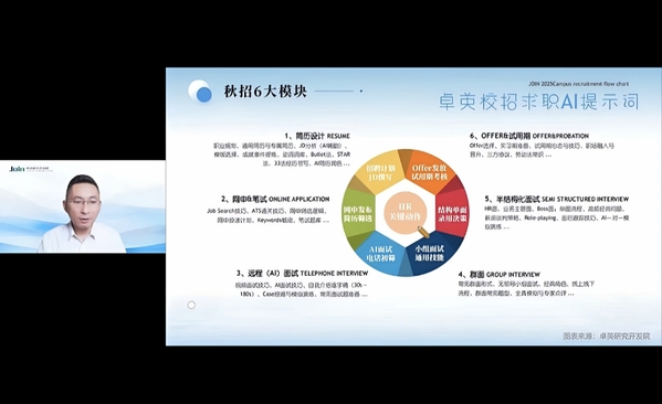 训练营线上讲座环节,卓英研究开发院院长张彤岩围绕2026届秋招整体形势、求职实用技能展开分享,重点讲解求职信息获取渠道、高分简历制作要领、名企网申注意事项及笔试应对技巧,为毕业生提供专业求职指导。