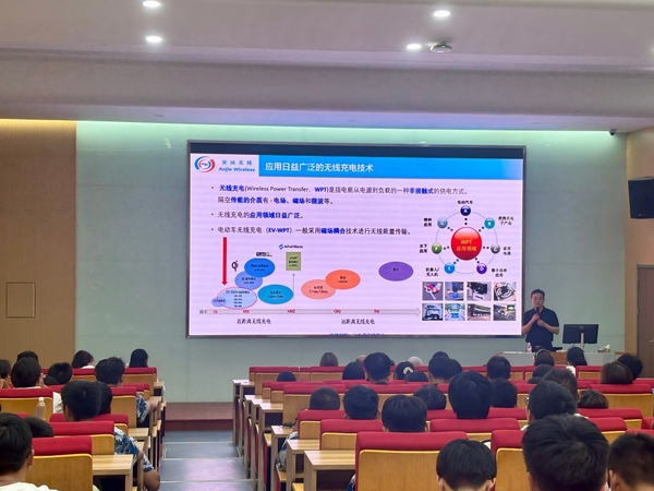 讲座中,宋磊博士以“有线充电与无线充电的对比”为切入点,深入浅出地介绍了无线充电的基本原理和技术分类。他结合电动汽车市场的发展趋势,系统阐释了自动充电的多元化路径,以及无线充电在赋能自动驾驶中的重要作用。同时,他还从国家政策导向、产业发展前景及实际应用案例等多个维度展开讲解,帮助同学们更直观、全面地认识无线充电的现实意义和未来潜力。