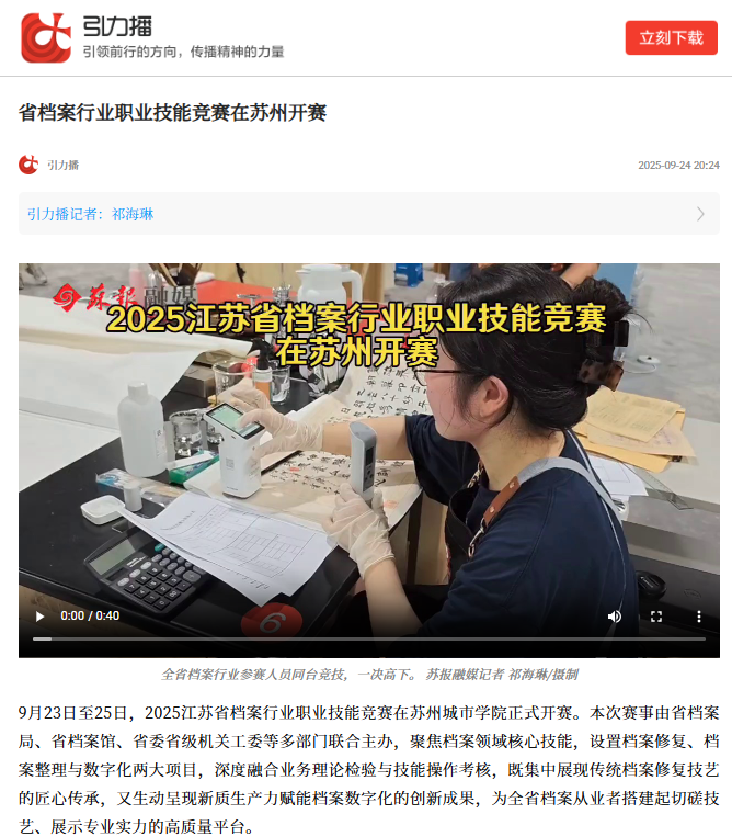 9月23日至25日,2025江苏省档案行业职业技能竞赛在苏州城市学院正式开赛。本次赛事由省档案局、省档案馆、省委省级机关工委等多部门联合主办,聚焦档案领域核心技能,设置档案修复、档案整理与数字化两大项目,深度融合业务理论检验与技能操作考核,既集中展现传统档案修复技艺的匠心传承,又生动呈现新质生产力赋能档案数字化的创新成果,为全省档案从业者搭建起切磋技艺、展示专业实力的高质量平台。