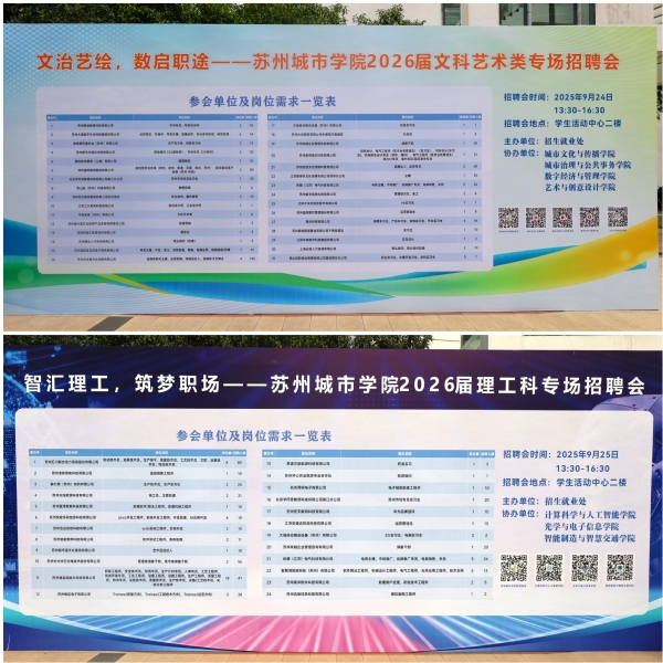 为深入贯彻习近平总书记关于高校毕业生就业工作的重要指示批示精神,助力2026届毕业生精准对接适配岗位、实现专业与职业的顺畅衔接,我校于9月24日、25日在学生活动中心二楼分专题举办“文治艺绘,数启职途”苏州城市学院2026届文科艺术类专场招聘会、“智汇理工,筑梦职场”苏州城市学院2026届理工科专场招聘会。