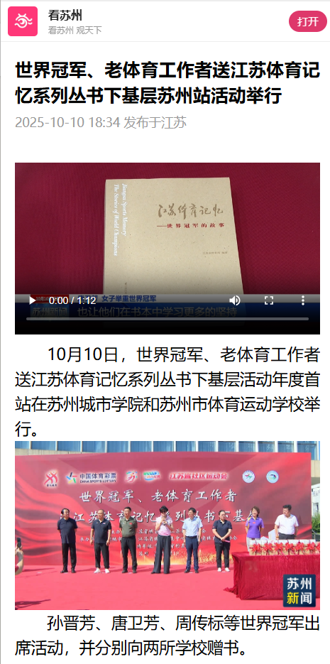 10月10日,世界冠军、老体育工作者送江苏体育记忆系列丛书下基层活动年度首站在苏州城市学院和苏州市体育运动学校举行。