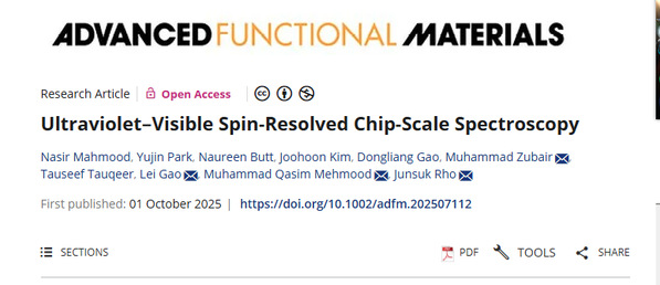 近日,我校光学与电子信息学院Nasir Mahmood副教授、高雷副校长联合旁遮普信息技术大学、浦项工科大学研究人员共同提出了一种新型芯片级自旋分辨光谱方法,实现了对紫外至可见波段光的自旋选择性调控。相关研究成果以“Ultraviolet–Visible Spin‐Resolved Chip‐Scale Spectroscopy”为题,于2025年10月1日发表在国际权威期刊《Advanced Functional Materials》(JCR-Q1,IF = 19)。该项研究由苏州城市学院光学与电子信息学院位第一单位,Nasir Mahmood博士为该篇论文的第一作者,高雷副校长为共同通讯作者。