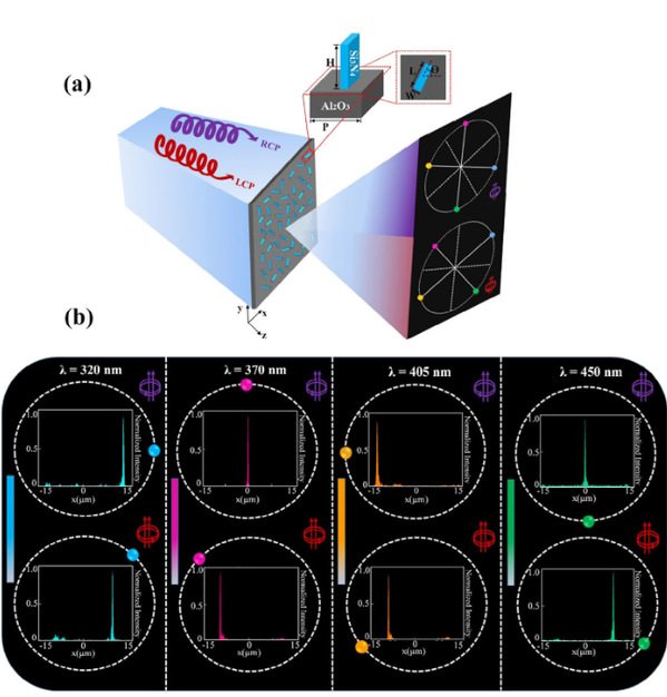 芯片尺度上实现紫外到可见光谱的高精度探测对于推进农用化学品和制药行业的发展至关重要。然而,由于体积庞大且结构复杂,同时获取光谱和偏振信息一直是光谱学领域的难题。本研究开发并实验验证了一种双波段、高效的圆偏振复用多焦点金属透镜光谱仪,可在紫外至可见波长范围内解读光谱内容和偏振信息。该设计采用带隙工程化的CMOS兼容氮化硅,优化单元素平面阵列以复合多个光学组件的功能。这种设计方法简化了光学信息处理过程,并支持便携式手性光谱仪的生成,在环境监测、医疗保健等众多应用领域展现出了突出的应用前景。该项工作得到了国家自然科学基金、江苏省自然科学基金、苏州基础研究项目等多项研究基金的支持。