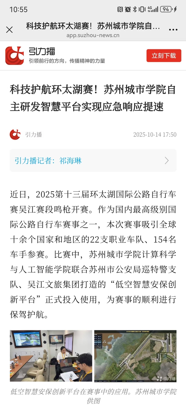 近日,2025第十三届环太湖国际公路自行车赛吴江赛段鸣枪开赛。作为国内最高级别国际公路自行车赛事之一,本次赛事吸引全球十余个国家和地区的22支职业车队、154名车手参赛。比赛中,苏州城市学院计算科学与人工智能学院联合苏州市公安局巡特警支队、吴江文旅集团打造的“低空智慧安保创新平台”正式投入使用,为赛事的顺利进行保驾护航。