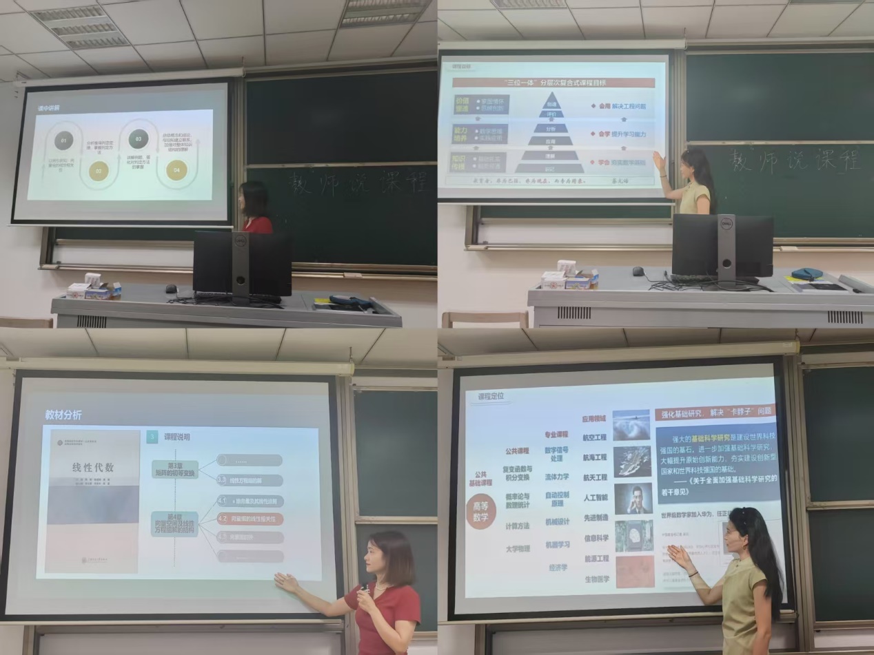 蒋清扬老师在阐述《高等数学(一)上》课程时,系统梳理了教材的知识体系,明确了其作为理工科基础核心课程的定位。她围绕课程目标,结合生产生活实例生动说明了微积分的广泛应用,并分享了其富有特色的教学方法,体现了扎实的教学功底。史莹老师在对《线性代数》的说课中,精准分析了教材的核心概念,强调了该课程作为现代数学语言的重要地位。她以信息技术等领域的实际应用为例,直观展示了课程价值,并介绍了旨在化抽象为具体的教学方法,体现了创新的教学思路。