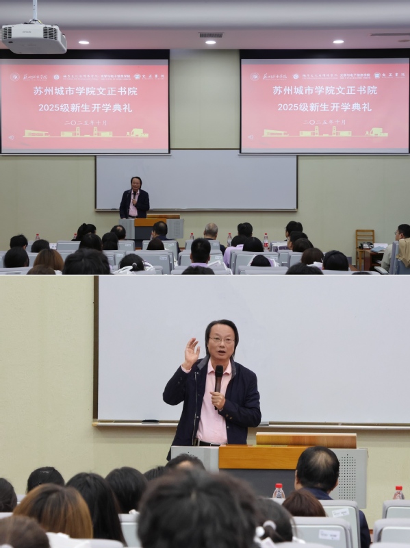 10月22日下午,我校文正书院2025级新生开学典礼在3号楼201室举行。苏州城市学院校长赵志宏,副校长吴昌政,教务处处长许宜申,光学与电子信息学院党委书记宋丹,城市文化与传播学院副院长、文正书院院长陈国安,党委副书记卞海勇,副院长涂小马,党委学生工作部(学生工作处、人民武装部)青年干事王一,文正书院2025级新聘任导师、班主任以及文正书院全体新生参加典礼。典礼由25书院文科基地班班主任高石老师主持。