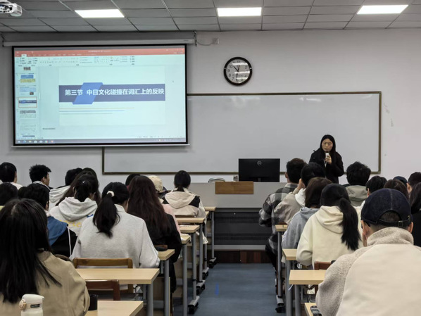示范课由日语系讲师邓清晨主讲,主题为“中日文化碰撞在词汇上的反映”。邓老师通过丰富生动的语言案例,系统阐释了中日语言交流中所体现的文化差异与融合现象,引导学生从词汇层面深入理解文化互鉴的意义与价值。