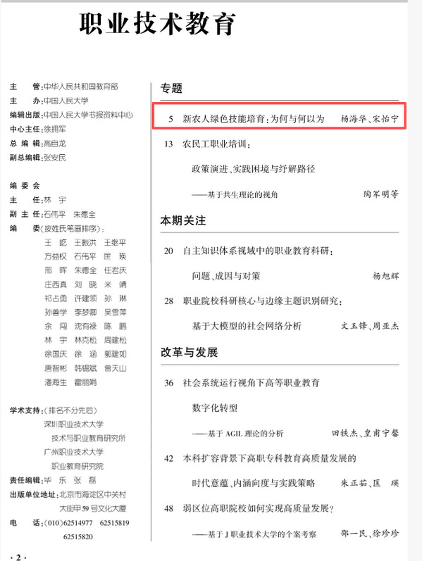 近日,苏州城市学院马克思主义学院杨海华教授发表于《职教通讯》的学术论文《新农人绿色技能培育:为何与何以为》被中国人民大学《复印报刊资料·职业技术教育》2025年第11期全文转载。