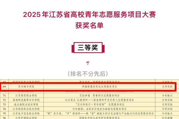 近日,2025年江苏省高校青年志愿服务项目大赛江苏省选拔赛成功举办。本届大赛共有245个项目入围线上阅评,我校团委积极响应,组织师生备赛参赛,经过项目资格审核、专家线上阅评等环节,我校“翠微君服务驿站”志愿服务项目荣获三等奖。