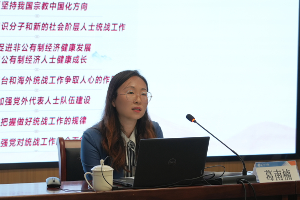 葛南楠处长以“新时代无党派人士和党外知识分子统战工作理论与方针政策”为主题,为我校党外知识分子代表开展专题培训,有效强化理论武装、提升能力素质,进一步巩固了团结奋斗的共同思想政治基础。