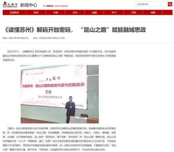 4月2日下午,《读懂苏州》系列讲座第三讲“开放苏州”在苏州城市学院教学楼2-101精彩开讲。本次讲座特邀昆山市委党史研究室主任王豪博士作《故事里的昆山之路》专题讲座。讲座由苏州城市学院马克思主义学院杨海华教授主持。