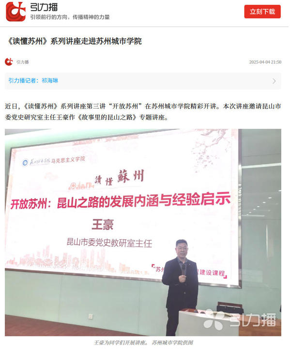 近日,《读懂苏州》系列讲座第三讲“开放苏州”在苏州城市学院精彩开讲。本次讲座邀请昆山市委党史研究室主任王豪作《故事里的昆山之路》专题讲座。