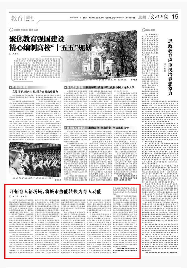 11月4日,《光明日报》15版“教育周刊·思想”刊登我校马克思主义学院教授杨晶和党委书记周玉玲署名文章《开拓育人新场域,将城市势能转换为育人动能》,全面报道了我校在融城思政领域的创新实践。文章指出,新时代人文经济学既承载着城市文明形态创新的价值引领,又与思政教育“培根铸魂、启智润心”的本质要求深层耦合。通过贯通思政理论课堂与城市发展实践,能够将城市现代化的磅礴势能转化为立德树人的现实动能。这一实践进路,对于培养担当民族复兴大任的时代新人具有独特而深远的价值。