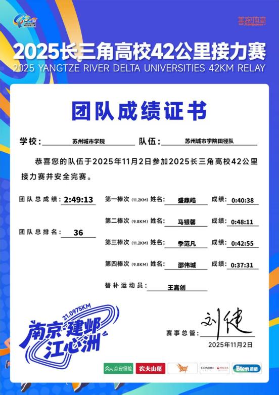 11月2日,由上海市大学生体育协会、江苏省学校体育联合会、浙江省学校体育协会及安徽省学校体育协会共同指导,南京市建邺区人民政府主办的“2025长三角高校42公里接力赛”在南京市顺利举行。本次赛事吸引了来自长三角地区100余所高校的近200支队伍参赛,是目前国内规模最大的高校42公里接力赛事。