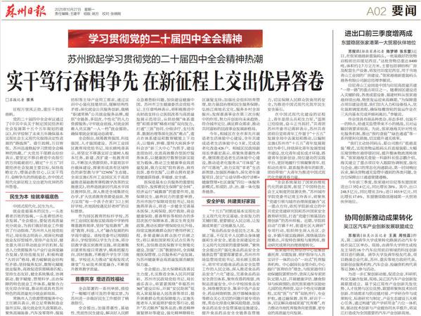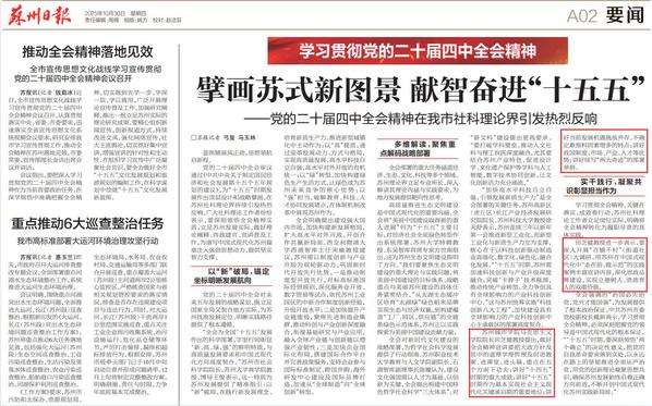 《苏州日报》(10月27日A02版)在报道苏州学习贯彻全会精神热潮时,专访了校党委书记周玉玲。她表示,全会系统谋划了国家治理现代化的新蓝图,彰显了中国特色社会主义制度的显著优势。学校将聚焦“党建引领与城市治理深度融合”,依托新成立的中共党史党建研究院和苏州国家安全教育研究院,打造“党建引领基层治理创新”的苏州样板。近期,学校将启动“百镇千村、街道社区大调研”专项行动,组织师生深入社区、企业、乡镇开展实践调研,围绕基层治理难点,开发特色课程与案例库,推动研究成果向治理效能转化。