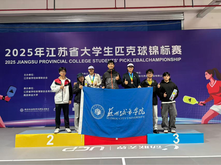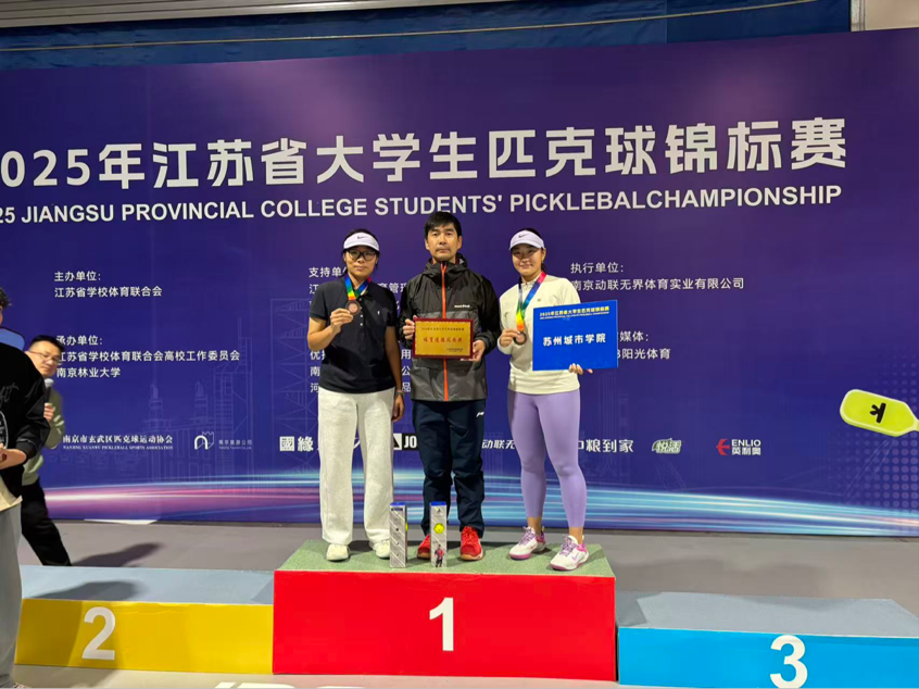 11月2日至5日,由江苏省学校体育联合会主办的2025年江苏省大学生匹克球锦标赛在南京市金陵匹克球运动中心成功举办。本次赛事汇聚了来自南京大学、东南大学等37所高校的200余名选手同场竞技。经过激烈角逐,我校匹克球运动队发挥出色,斩获甲B组女子双打季军,并荣获“体育道德风尚奖”。