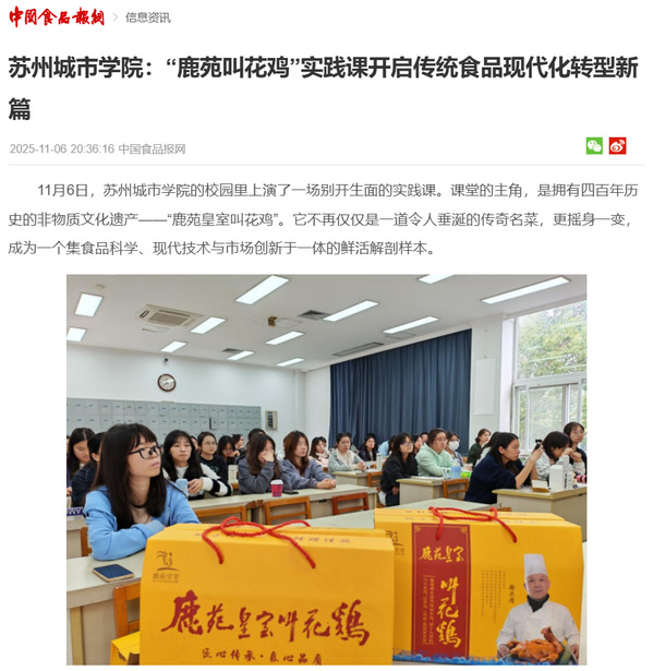 11月6日,苏州城市学院的校园里上演了一场别开生面的实践课。课堂的主角,是拥有四百年历史的非物质文化遗产——“鹿苑皇室叫花鸡”。它不再仅仅是一道令人垂涎的传奇名菜,更摇身一变,成为一个集食品科学、现代技术与市场创新于一体的鲜活解剖样本。