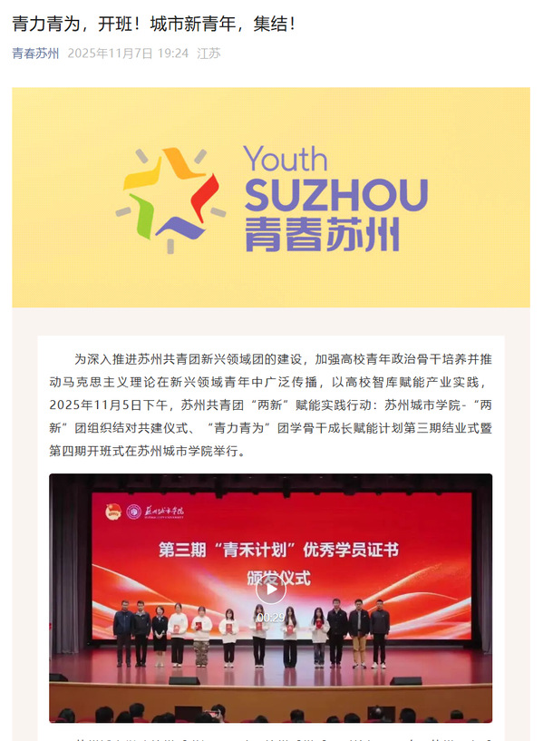 为深入推进苏州共青团新兴领域团的建设,加强高校青年政治骨干培养并推动马克思主义理论在新兴领域青年中广泛传播,以高校智库赋能产业实践,2025年11月5日下午,苏州共青团“两新”赋能实践行动:苏州城市学院-“两新”团组织结对共建仪式、“青力青为”团学骨干成长赋能计划第三期结业式暨第四期开班式在苏州城市学院举行。
