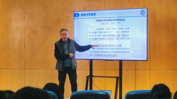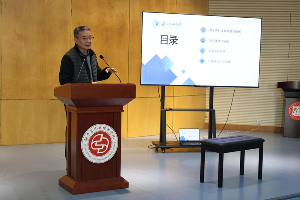 涂小马对前半学期的教学工作进行了系统梳理。首先,他通报了教学资料抽查情况,详细分析了被抽查课程的核查指标,指出当前存在的教学大纲、进度表及试卷格式不规范等共性问题,并特别强调了部分课程考试卷重复率偏高、试卷分析与成绩分布矛盾等现象,对后续相关材料提出了明确规范要求。随后,他结合统计数据通报了本学期调停课情况,重申教师须严格遵守教学工作管理规定。接着,在重要文件宣讲环节,他再次深入解读了试卷格式规范与课程考核管理办法。最后,他就基层教学组织建设、新教师培养培训、教学管理制度学习与课堂教学质量提升等近期重点工作作出提醒,并部署了下学期的课程安排与教材填报工作。