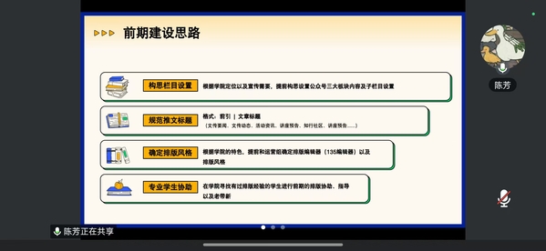 会上,陈芳应邀作题为“城市文化与传播学院媒体宣传部建设情况汇报”的专题分享,系统介绍了学院媒体宣传部的发展历程、工作流程以及人才培养机制,并重点展示了一批体现学院专业特色与创新活力的原创网络作品,充分展现了学院新媒体宣传工作的扎实基础与品牌成效。
