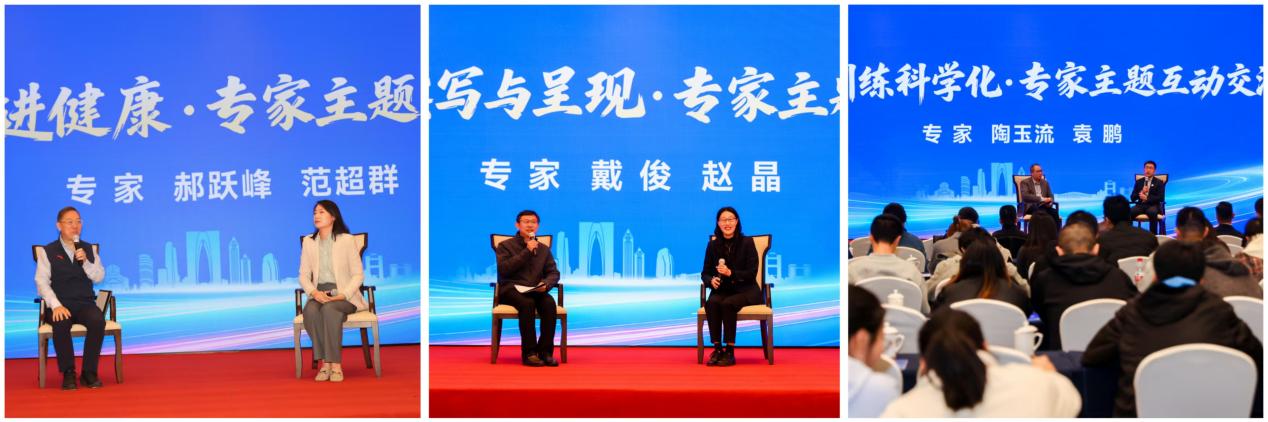 在专家主题交流环节,上海体育大学竞技运动学院副院长、研究员袁鹏,国家体育总局体育科学研究所副研究员范超群,《天津体育学院学报》编辑部主任、教授赵晶,中国高等教育学会体育专业委员会常务理事、教授戴俊等6位权威专家围绕“运动促进健康”“体育训练科学化”“体育学术研究成果撰写与呈现”三个维度开展互动交流,为与会人员带来前沿学术见解与实用指导。