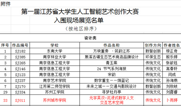 11月21日,第一届江苏省大学生人工智能艺术创作大赛优秀作品展在南京开幕。我校艺术与创意设计学院24环艺(Z)班卜雨婷、陆炀、何靖雯三位同学组队创作的《元宇吴汉-沉浸式数字人文交互艺术空间》获评设计类优秀作品并入围展览。